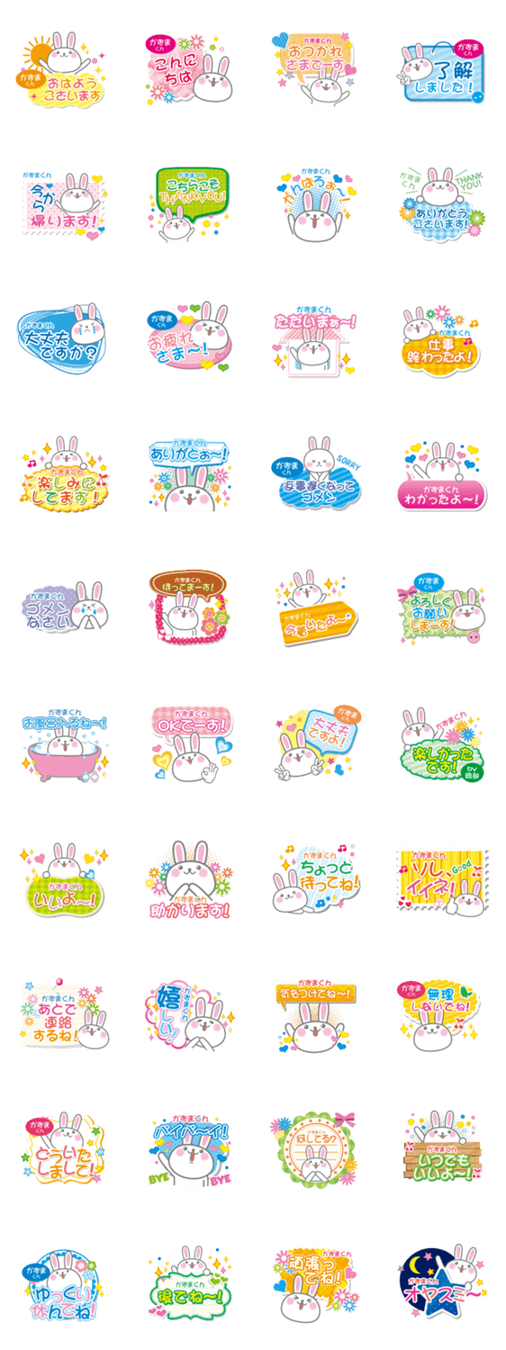 | スタンプ説明 | かずまくんに送る専用。挨拶や敬語などを織り交ぜた、 日常会話で使いやすい可愛いうさぎのスタンプです。 |