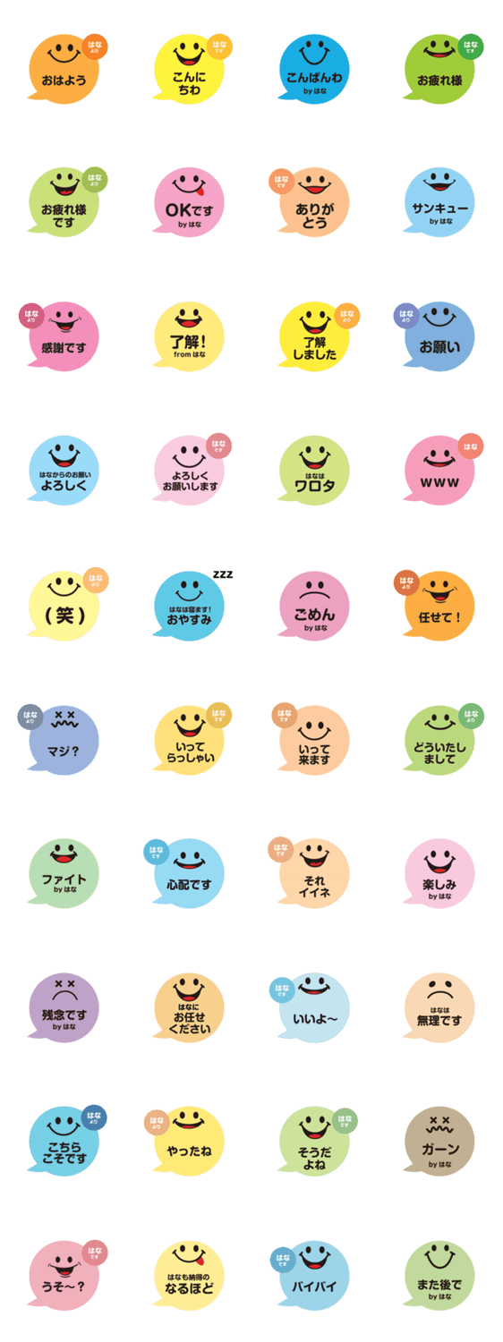 | スタンプ説明 | はなさんが毎日使える吹き出しタイプのスマイルフェイス。日常会話や敬語など、使いやすい内容を収録。 |
