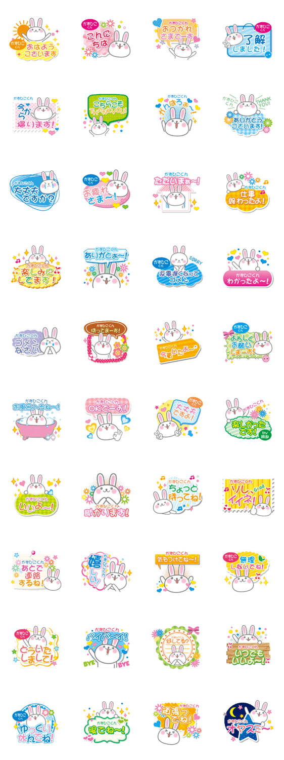 | スタンプ説明 | かずひこくんに送る専用。挨拶や敬語などを織り交ぜた、 日常会話で使いやすい可愛いうさぎのスタンプです。 |