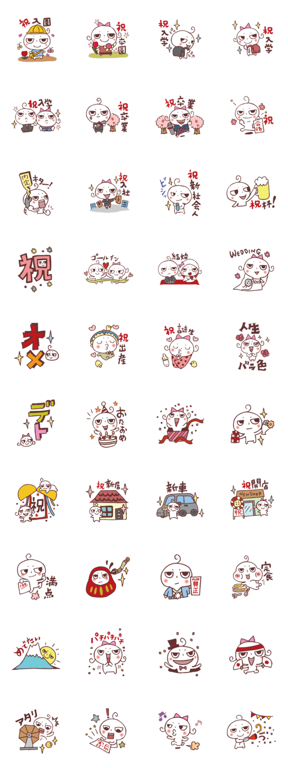 無愛想くんが各種お祝い申し上げます。入園・入学・卒園・卒業・入社・新社会人・合格・結婚・出産・誕生日などめでたい時に使いまくりましょう。無愛想ちゃんも仲間入り!