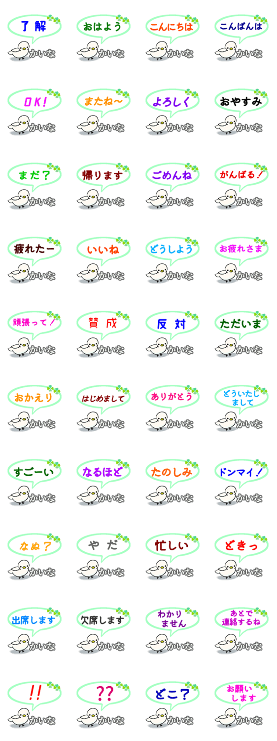 かいなさん専用。おはよう、頑張って、了解、出席、欠席、賛成、反対など挨拶、日常会話、連絡用にどうぞ。