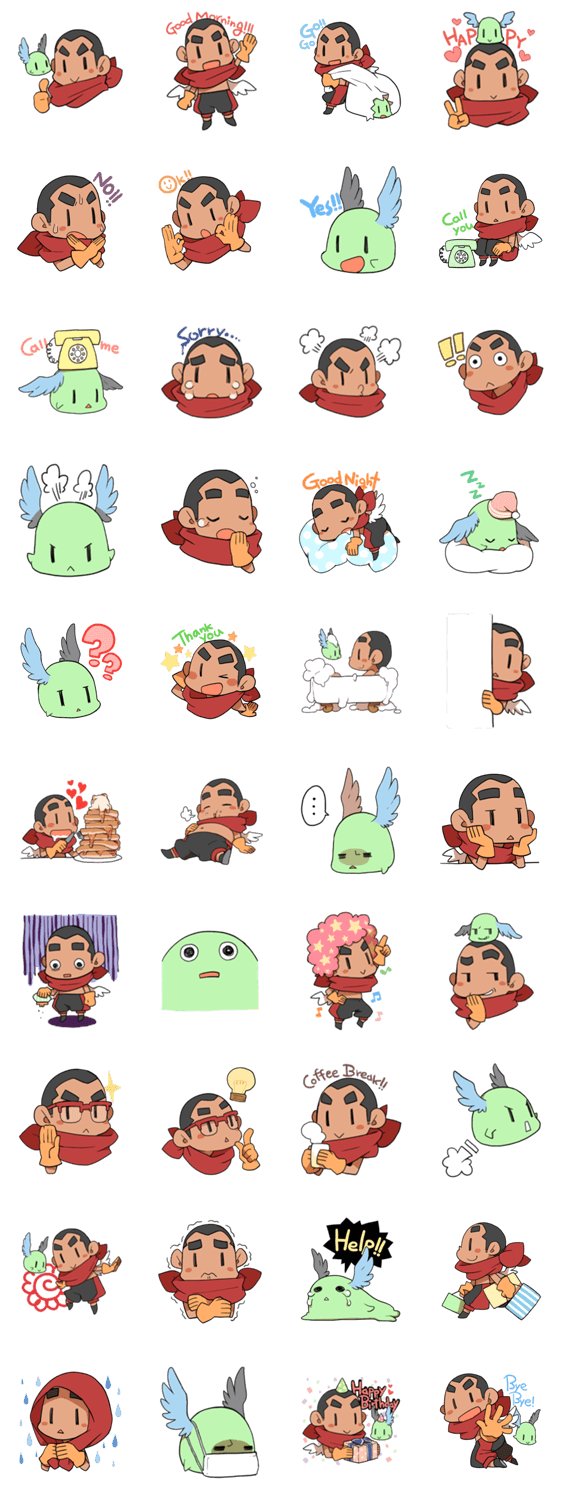 「シュガー★シューター サタンとフレイ」のスタンプです。羽の生えた坊主頭の男の子がサタン、緑色の丸いのがフレイです。