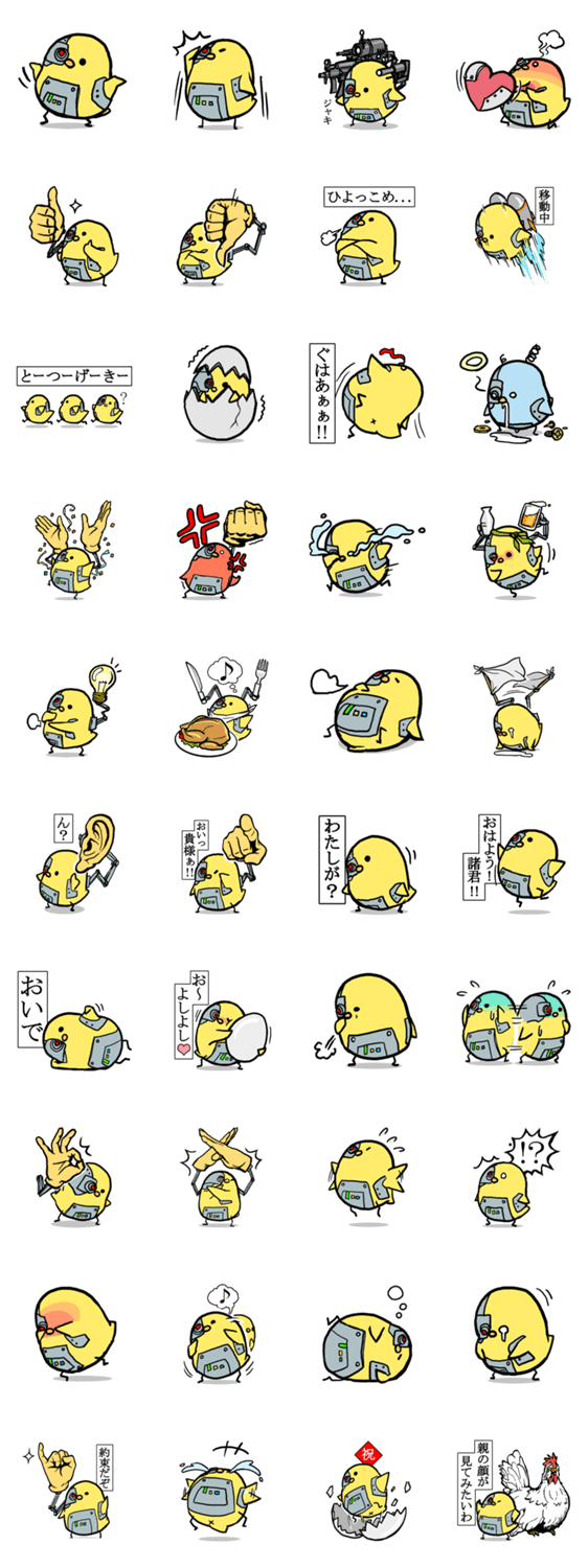 | スタンプ説明 | ひよっこ最終兵器『ひよこマンダー』あいさつや返事など、彼の実力は使われてこそ発揮されるということです、サー!よろしいならばスタンプだ!ヒヨコ!コマンダー!敬礼! |
