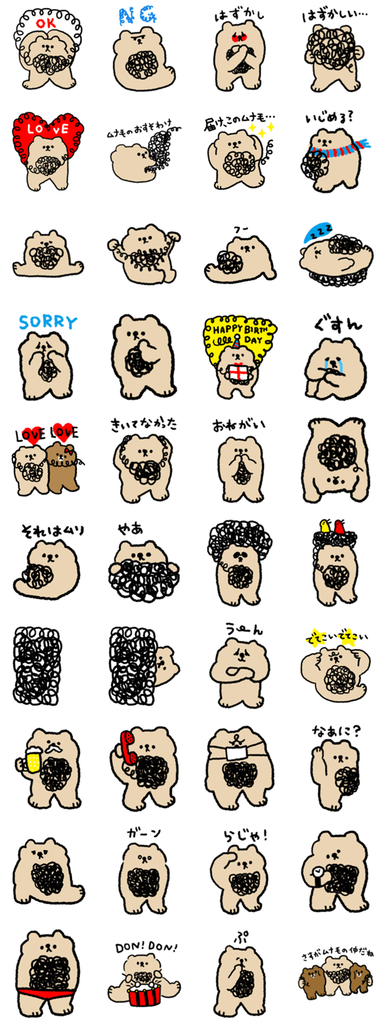 生まれつきもじゃもじゃムナ毛が生えているくまのスタンプです。あなたの気持ちをもじゃもじゃ伝えてくれます。
