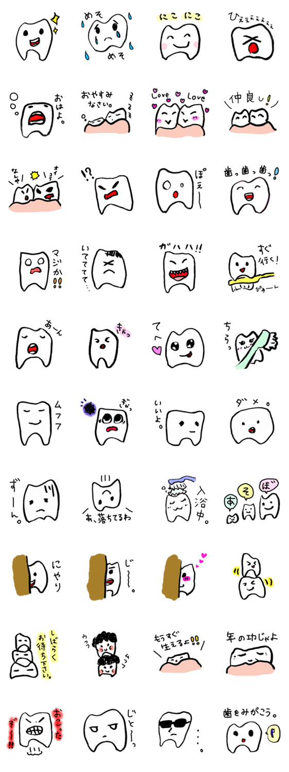 ゆる~い、歯のスタンプです。可愛い歯からクールな歯まで様々なキャラクターの歯が勢ぞろいです!