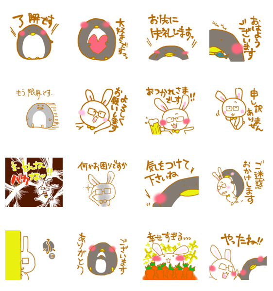 ペンギンとうさぎのおとぼけスタンプです。丁寧な言葉使いで作っているので、目上の方にも使用できます。ぜひ皆さまの日常に使用していただけたら幸いです。