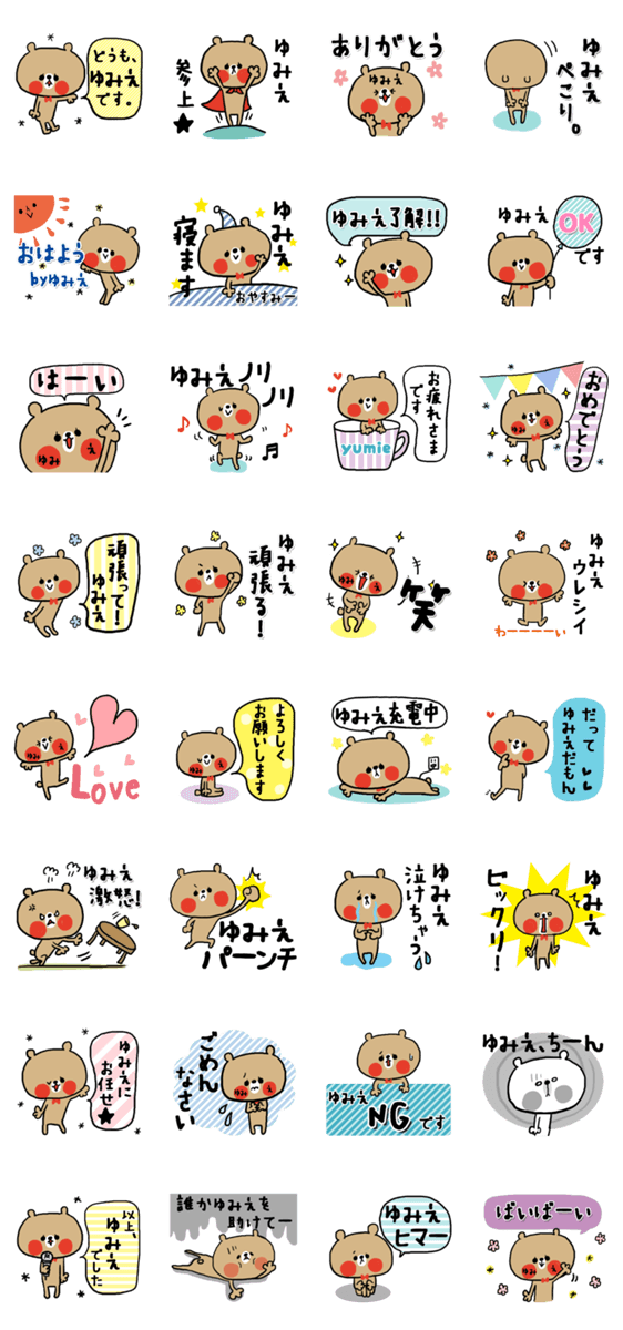 | スタンプ説明 | 友美恵さん、優美恵さん、弓絵さんetc...ゆみえさんの為の、かわいいお名前スタンプです。プレゼントにもどうぞ♪ |