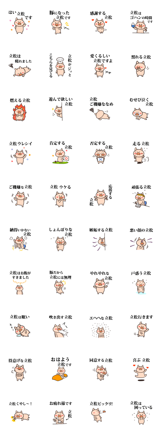 ぶたになりました。その最高に愛くるしいかわいい仕草で、日常的に使えるスタンプです。苗字が入った名前スタンプなので毎日使えるんです。ブー