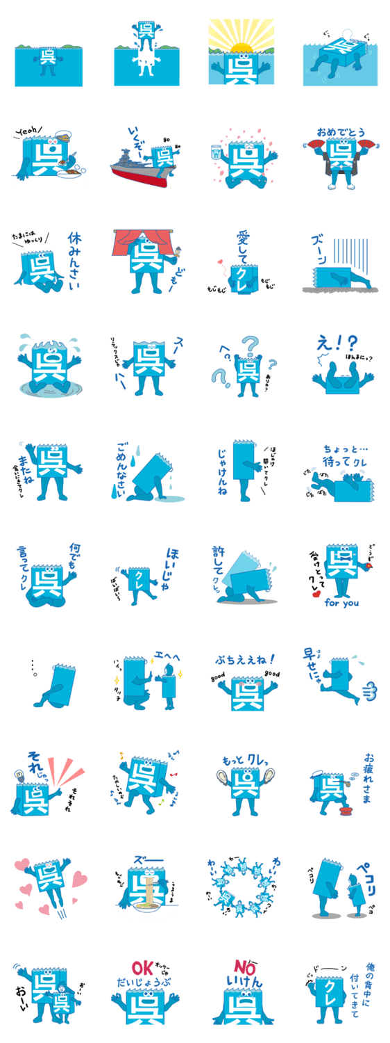| スタンプ説明 | 広島県呉市のPRキャラクター「呉氏(くれし)」がスタンプになりました。使ってクレ!そしてもっともっと呉のまちを愛してクレ! |