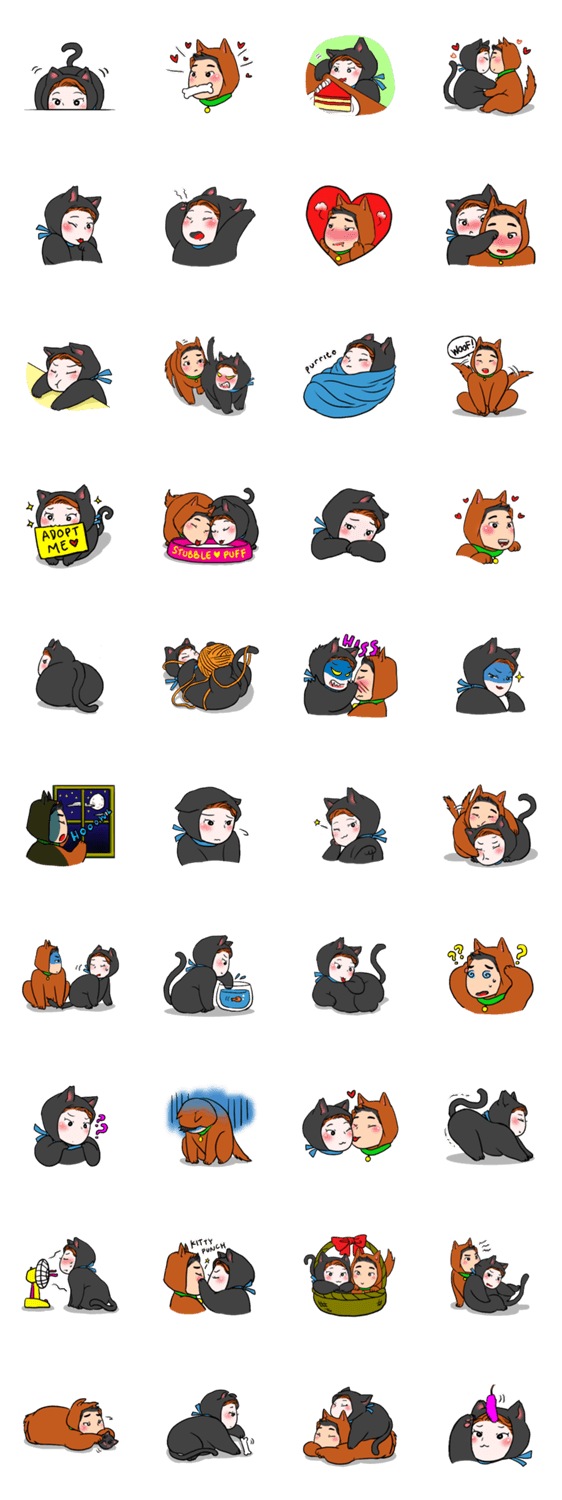 | スタンプ説明 | The loyal and loving Stubble. The flirty and sneaky Puff. The cat and dog are the lively pets of Choco and Pao. |