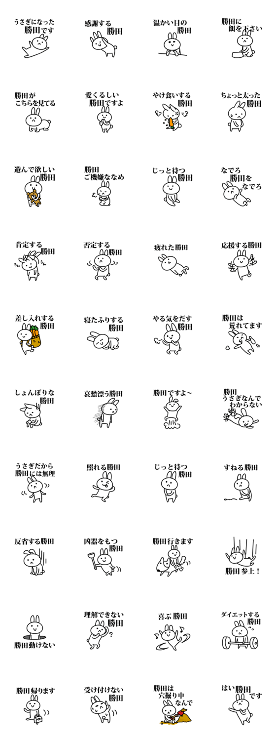うさぎになりました。その最高に愛くるしいかわいい仕草で、日常的に使えるスタンプです。苗字が入った名前スタンプなので毎日使えるんです。ぴょん