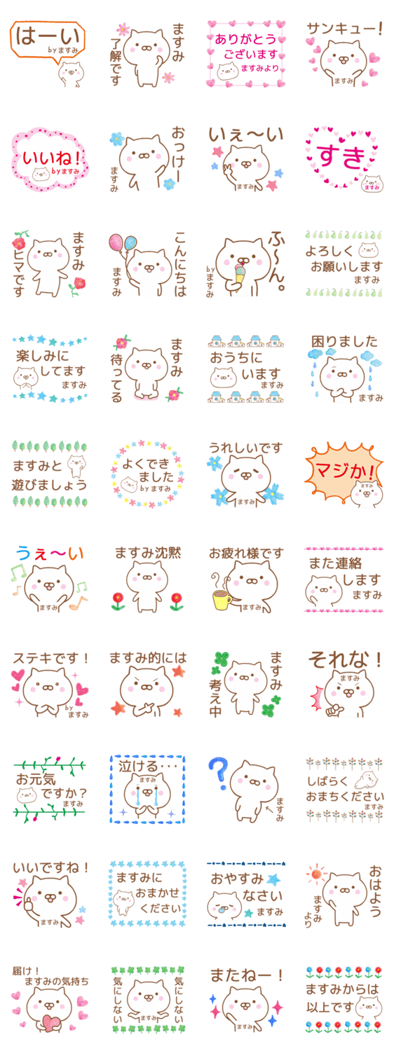 【ますみ】さんが使える、しんぷるな猫の名前スタンプです。毎日使いやすい無難な基本セットです。ますみ/マスミ/万澄/真清/眞住/益美/真純/真澄/益見/万寿/万須美/masumi
