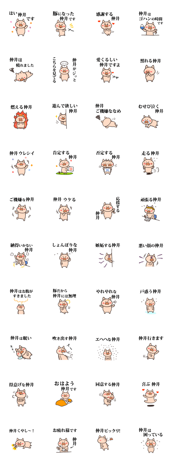 ぶたになりました。その最高に愛くるしいかわいい仕草で、日常的に使えるスタンプです。苗字が入った名前スタンプなので毎日使えるんです。ブー