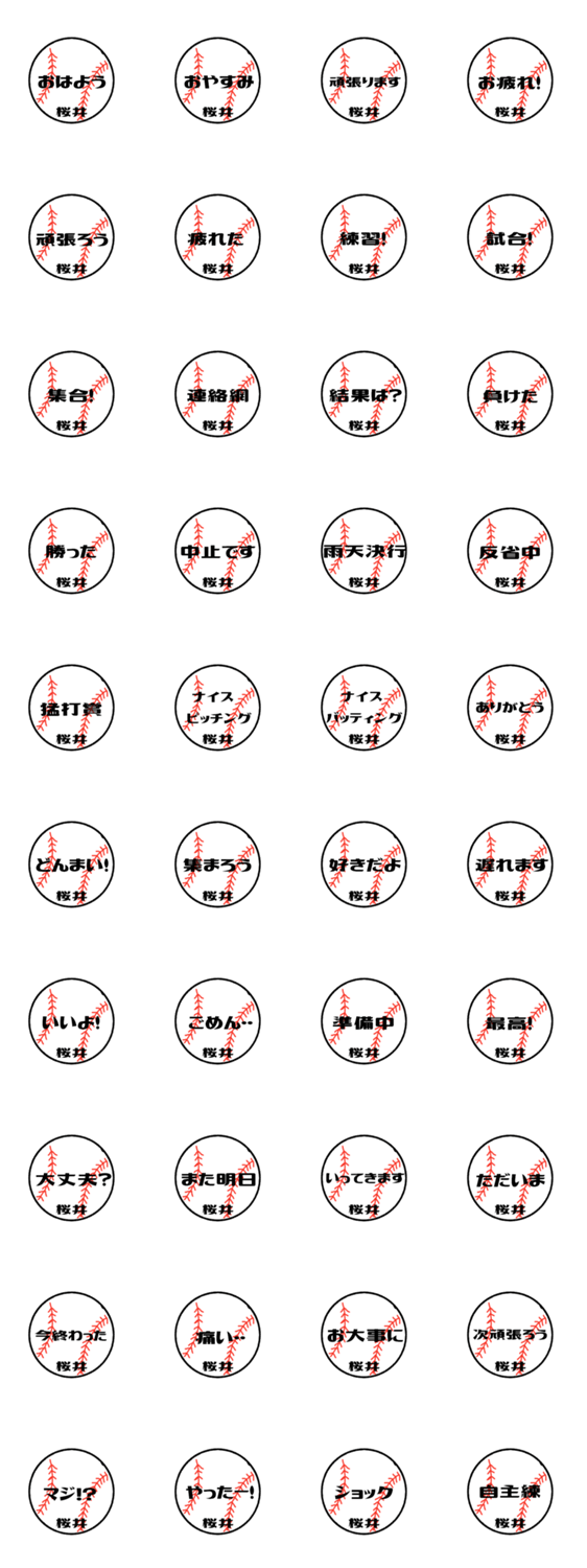 | スタンプ説明 | 名入り野球ボールが日常会話を盛り上げてくれる【ベースボールスタンプ】です。背番号入りも好評発売中!! |