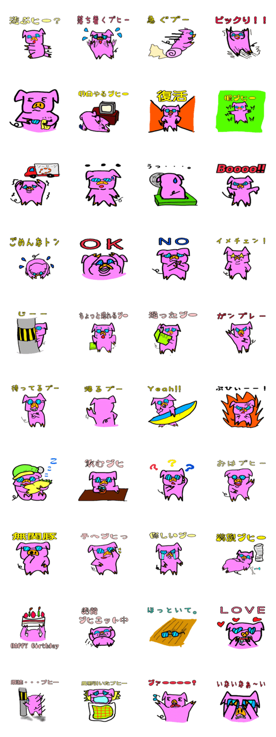 言葉を覚えた豚「ブヒヒブヒー」による、人語と豚語を織り交ぜて喋るポップでキュートな日常会話スタンプです。