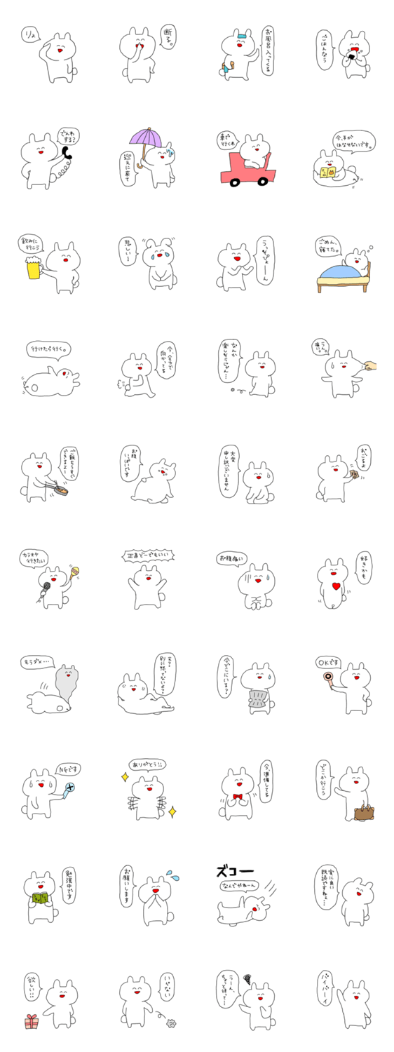 常に笑顔を絶やさない、笑うウサギ「ウサ吉」の日常スタンプです。ゆるい気分になりたい時、文字を打つのが面倒な時などに使ってやってください。