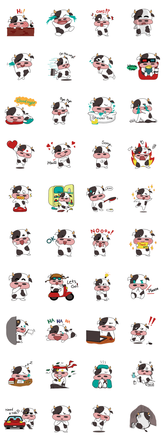 | スタンプ説明 | Holy Cow!, a cute milk cow with its unique big nostrils, is here and super excited to be in your chat rooms! |