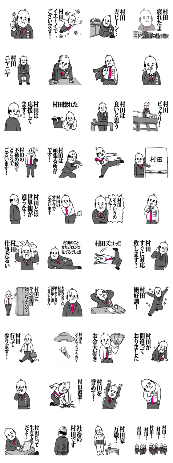 | スタンプ説明 | 村田(むらた)さんのためのシュールなハゲのサラリーマンのスタンプです。可愛いスタンプが物足りない方におすすめです! |