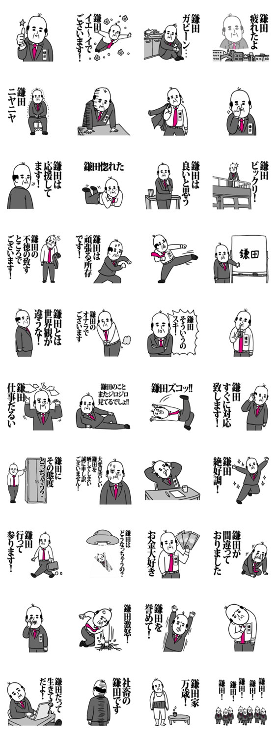 | スタンプ説明 | 鎌田(かまた.かまだ)さんのためのシュールなハゲのサラリーマンのスタンプです。可愛いスタンプが物足りない方におすすめです! |