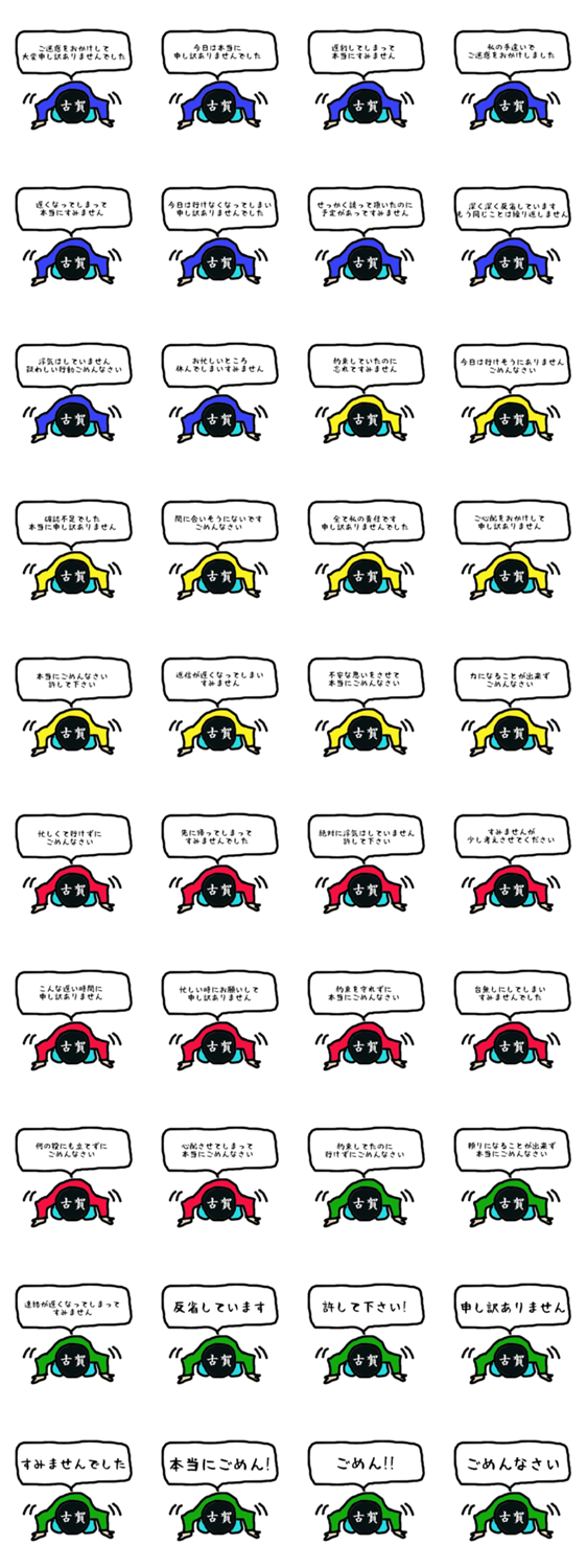 | スタンプ説明 | 古賀さん専用の謝罪スタンプ!!土下座でごめんなさいの気持ちを伝えられます。 |