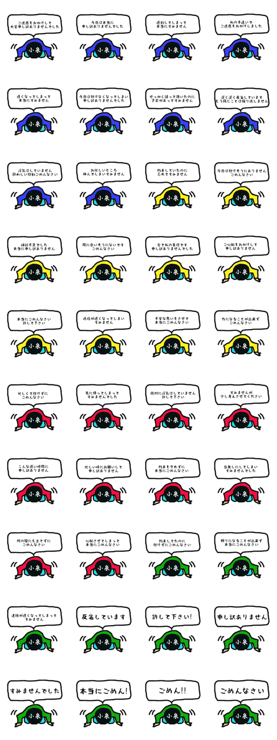 | スタンプ説明 | 小泉さん専用の謝罪スタンプ!!土下座でごめんなさいの気持ちを伝えられます。 |