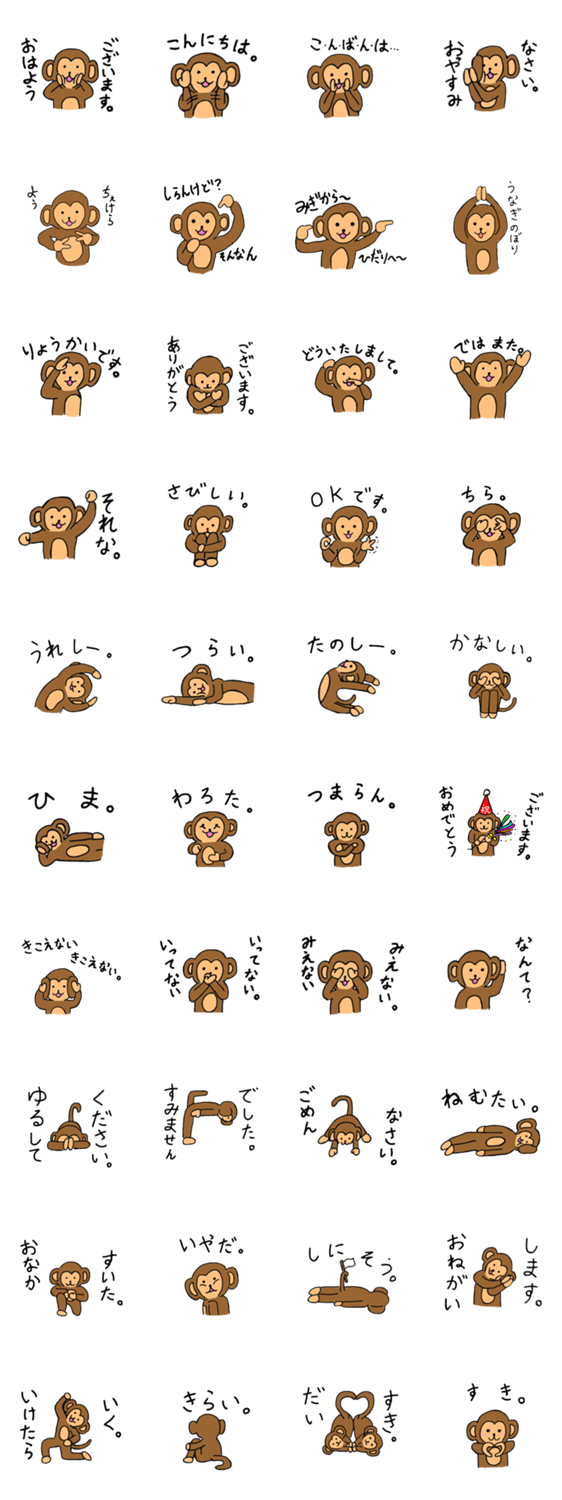 | スタンプ説明 | 敬語あり、感情あり、シュールありのシンプルなおさるさん達です。 |