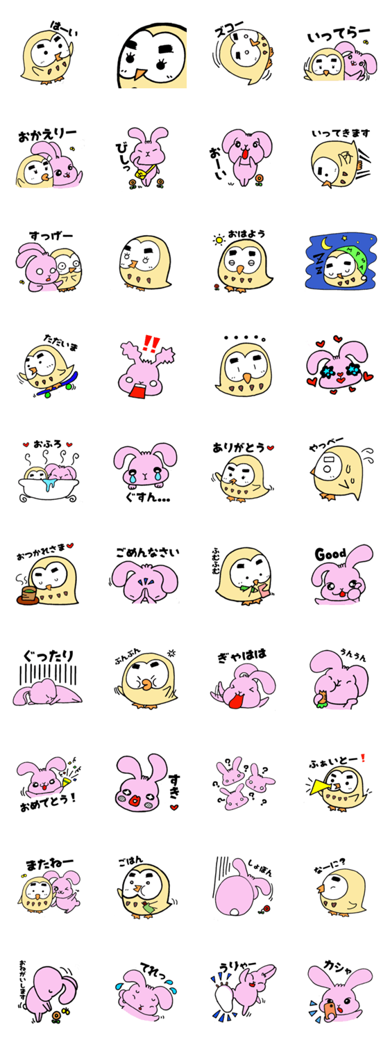 太いまゆげのフクロウとピンクのうさぎは仲良しさん