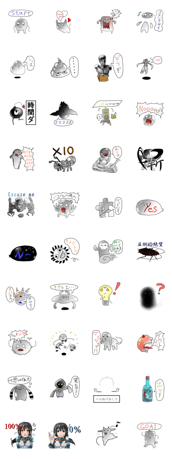 | スタンプ説明 | 金属チックな変な生き物たちです!!個性豊,愛情豊,表情豊かで可愛らしい奴らばっかりでございます(例外あり)ぜひ愛してください。 |