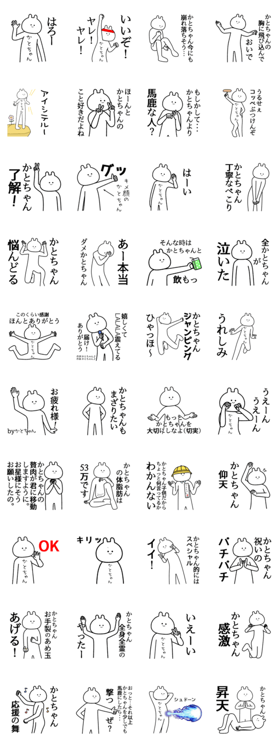 | スタンプ説明 | 「かとちゃん」が使う自由すぎるシュールで面白い名前スタンプです。カト/かとう/カトウ/加藤/加東/加糖/河東/たかと/わかと/隆人/貴人/敬人/孝人/貴斗/隆斗/など/専用 |