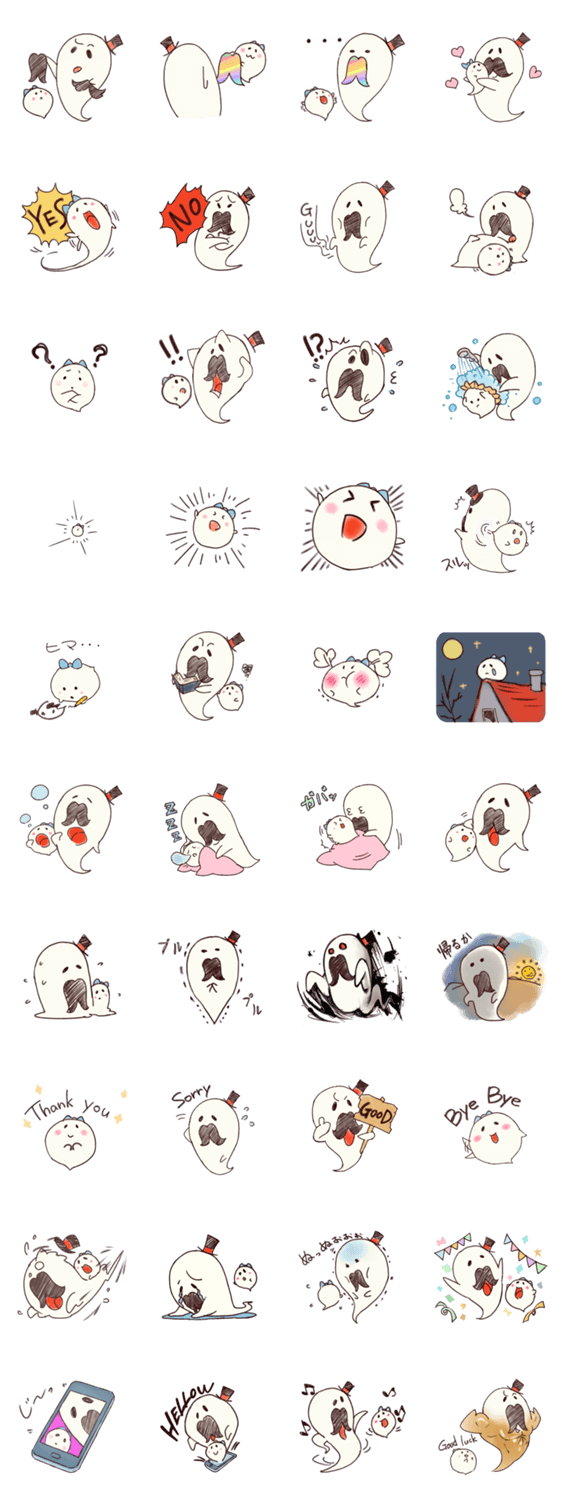 LINEスタンプの世界に迷いこんだ仲良しオバケ親子。二人がおりなす、ほのぼの日常系スタンプ♪