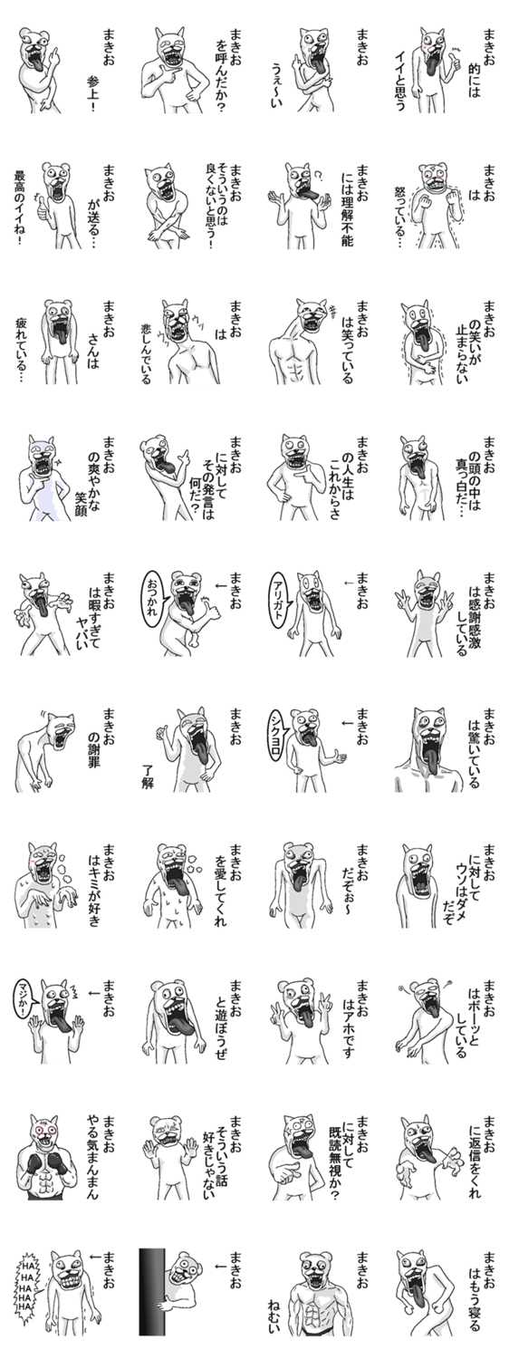 | スタンプ説明 | まきおさん専用インパクトある名前・名字スタンプ。牧夫/牧尾/牧男/槇尾/槙尾/巻尾/万喜夫/巻男/真紀男/真紀夫/真喜雄/牧郎/万紀夫/真木男。無難な面白いスタンプ。 |