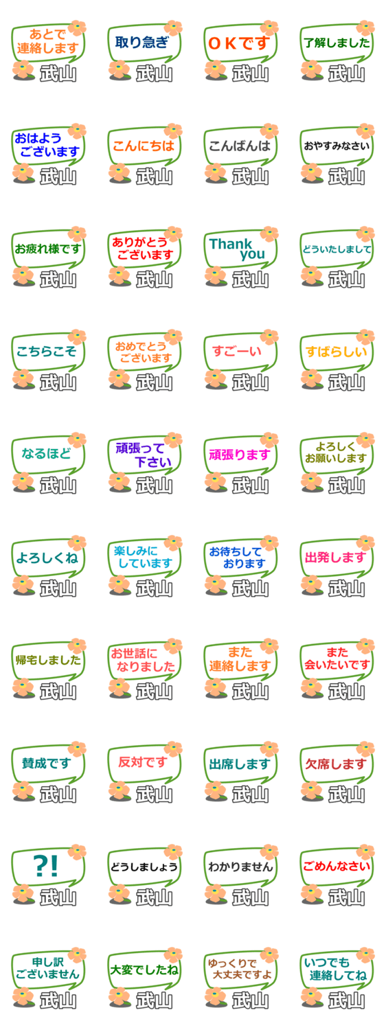 | スタンプ説明 | 取り急ぎ返信用【武山ぶざんブザンbuzanたけやま,たけざん】専用とりいそぎ.基本挨拶等,丁寧な日常会話,連絡用【父母,子供の日,親孝行】プレゼント用,お薦め簡単大きな文字 |