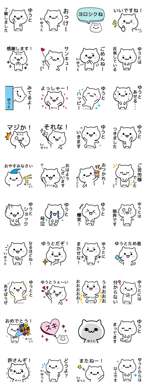 | スタンプ説明 | ゆうと/ユウト/有斗/湧人/優斗/裕人/雄人/裕翔/佑都さんなどが使える猫の名前スタンプです。日常会話で使いやすい基本セットです。 |