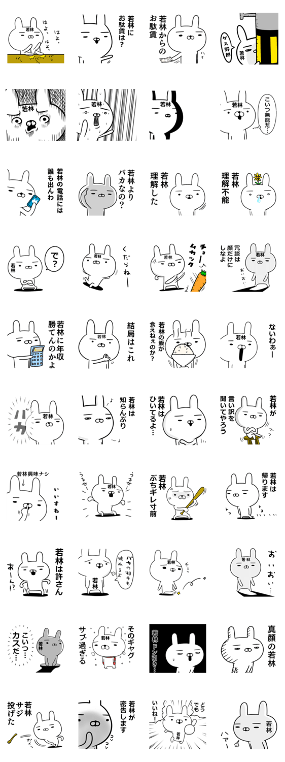 日本全国の苗字の中,若林さんの為の毒舌うさぎスタンプが登場。便利で名字が,わかばやしさんに使える‼家族,友達から,ワカバヤシちゃん・ワカバヤシさん・ワカちゃんへ♡