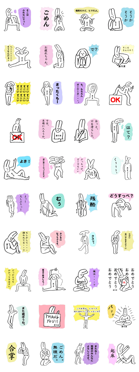 ありま(アリマ)専用スタンプ。ウサギによるちょっとキュートで、かなりシュールすぎて逆に使えるスタンプ。