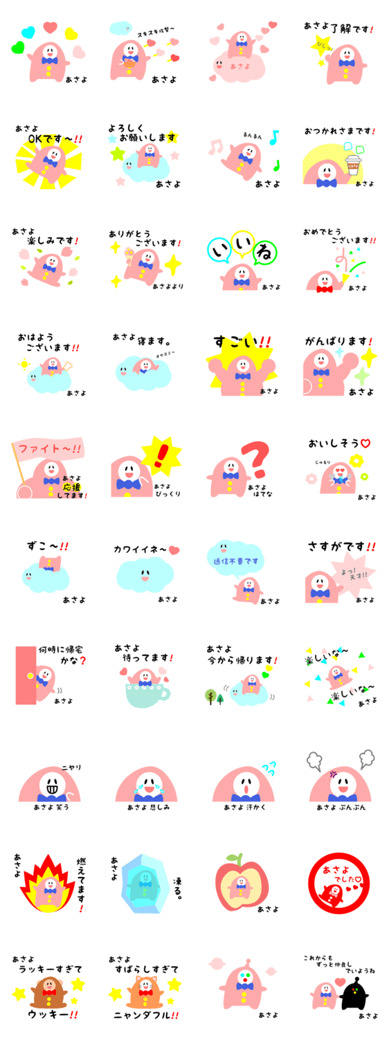 | スタンプ説明 | あさよさん専用の、イヌでもネコでもシロクマでもない地球外生物。ゆるくてかわいい宇宙人の名前スタンプです。 |