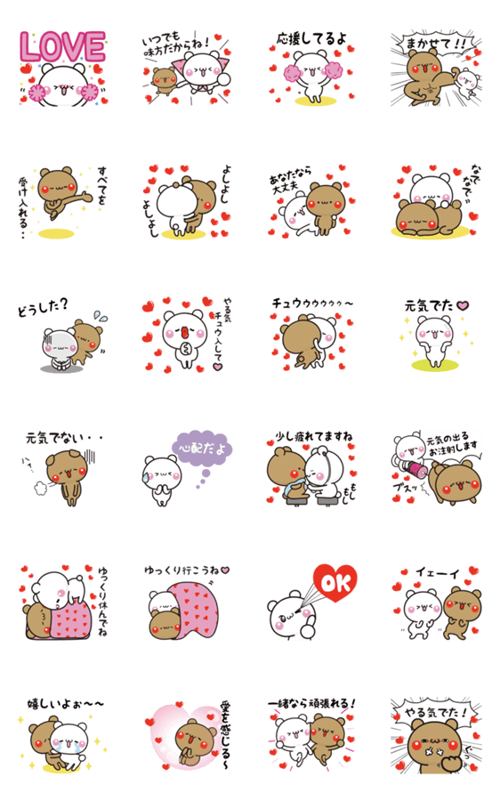 | スタンプ説明 | アモーレ♡くまくま第12弾。好きな人を応援したり励ましたりするスタンプです。彼氏、彼女、奥さん、旦那さんを元気付けてもっとラブラブになってね! |