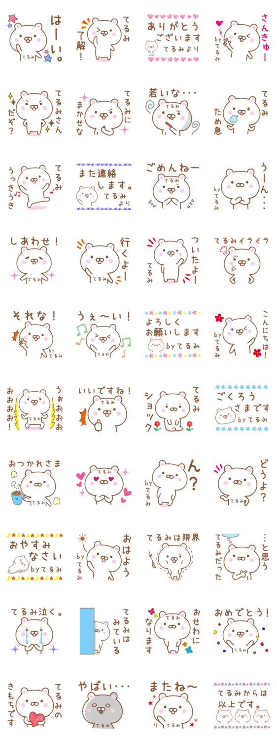 | スタンプ説明 | てるみさんが使える、クマの名前スタンプです。毎日使いやすいシンプルな基本セットです。てるみ/テルミ/輝美/照美/てる美/光美/terumi |