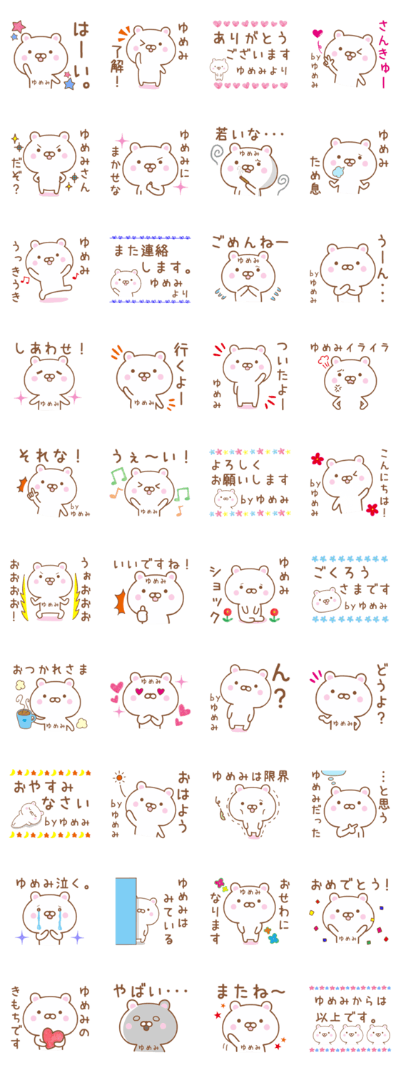 | スタンプ説明 | ゆめみさんが使える、クマの名前スタンプです。毎日使いやすいシンプルな基本セットです。ゆめみ/ユメミ/夢見/夢美 |