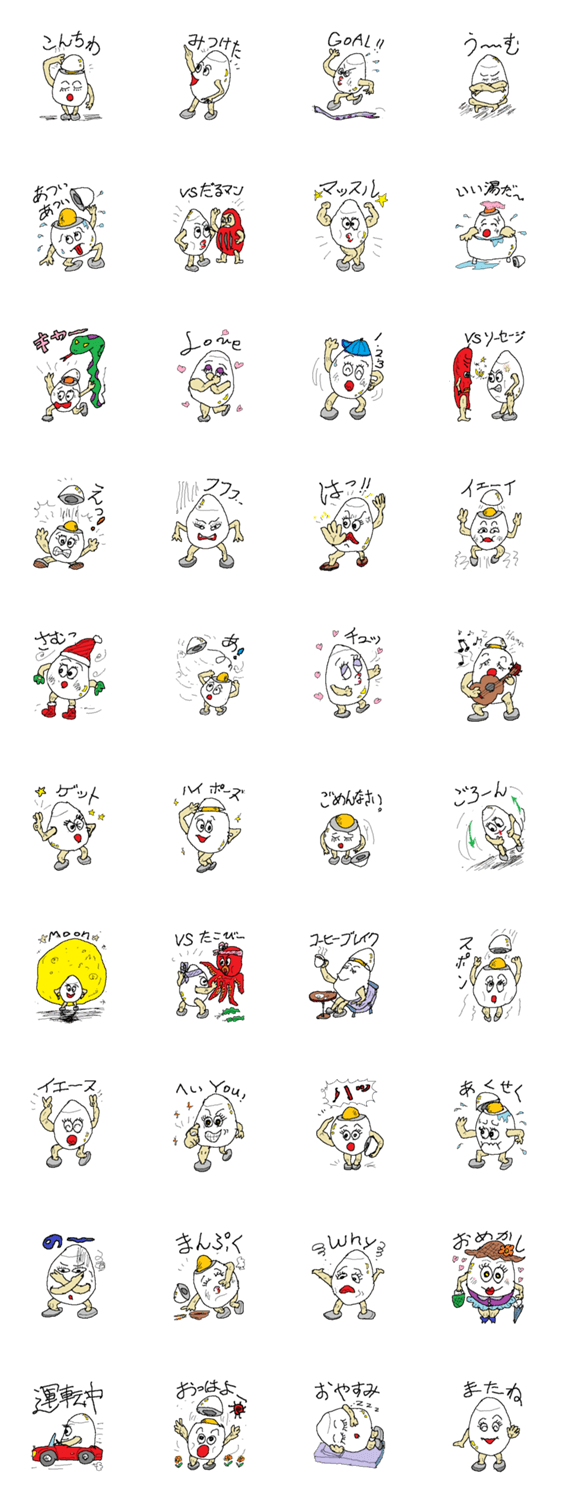ゆで玉子がモチーフのキャラクターが、色々な表情やポーズであなたの気持ちを友達に伝えます。