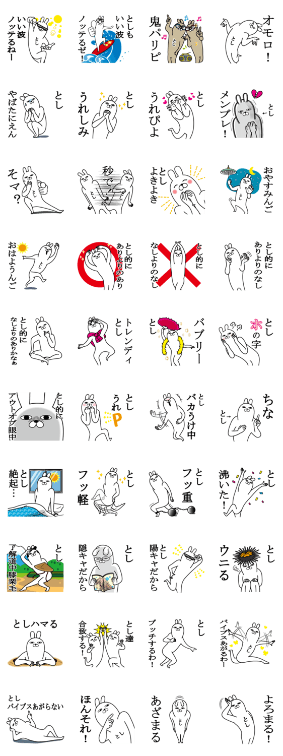 | スタンプ説明 | としが使える名前スタンプ。若者語,jk語もあり。としあき,としお,としひろ,としこ,としゆき,俊樹,としかず,敏子,利美,としよ,としえ,としみとしや全国のとしが付く人専用 |