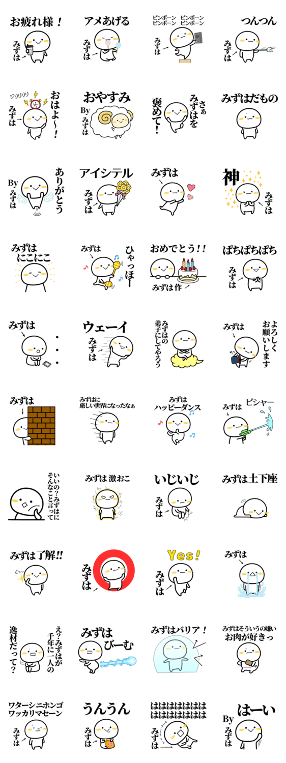 | スタンプ説明 | 『みずは』が使う単純でシンプルなデザインの名前スタンプです。みずちゃん/くん/ミズハ/美津羽/美津葉/美須葉/水巴/水羽/水葉/泉羽/泉花/瑞羽/瑞芭/瑞葉/泉葉/無難/専用 |
