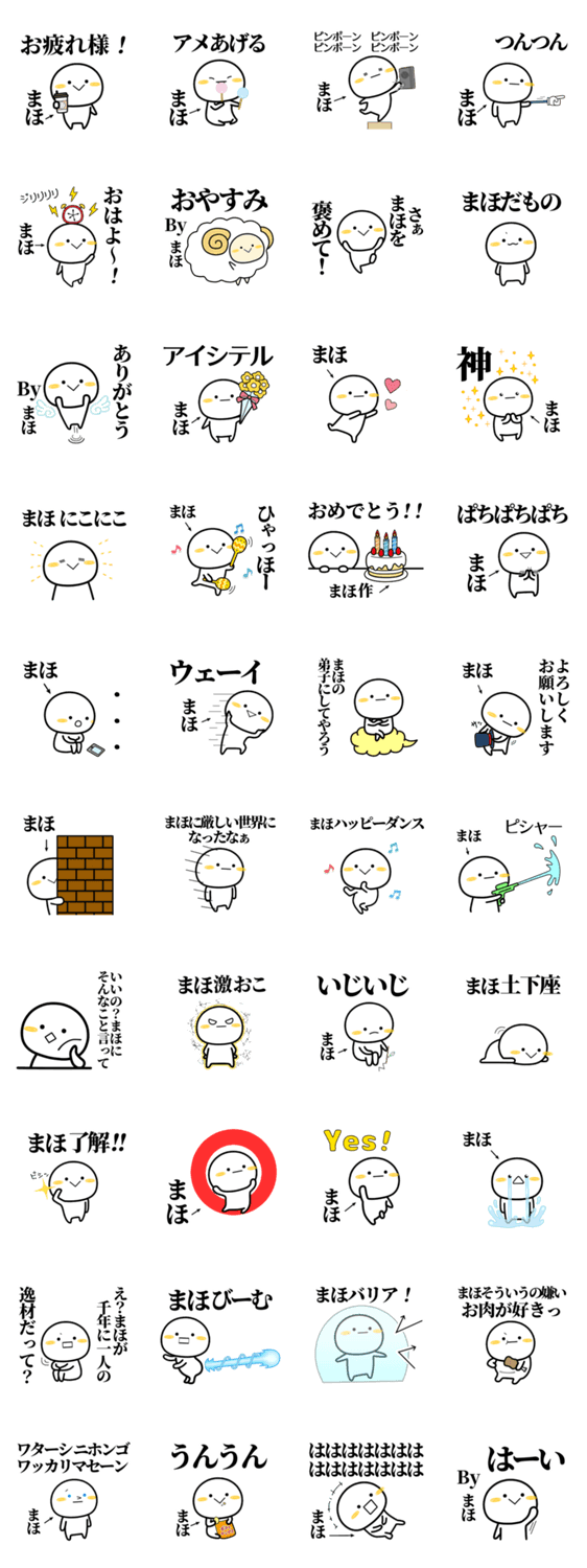 | スタンプ説明 | 『まほ』が使う単純でシンプルなデザインの名前スタンプです。マホ/まほちゃん/くん/真帆/真歩/真穂/真保/麻保/麻穂/麻帆/眞歩/眞穂/眞保/眞帆/まほこ/まほる/無難/専用 |
