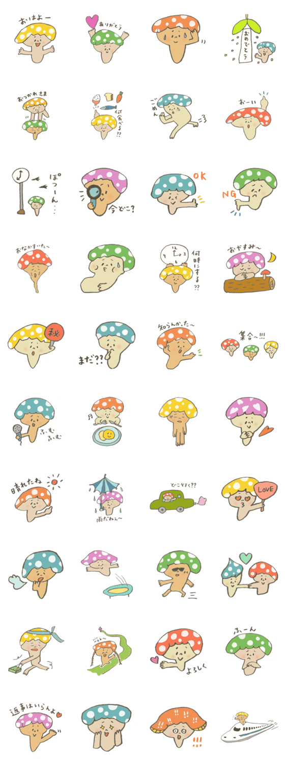きのこあたまのキノちゃんが、あなたの代わりにあれこれおしゃべりしてくれます。イラストレーター むらたさき のスタンプ第二弾。