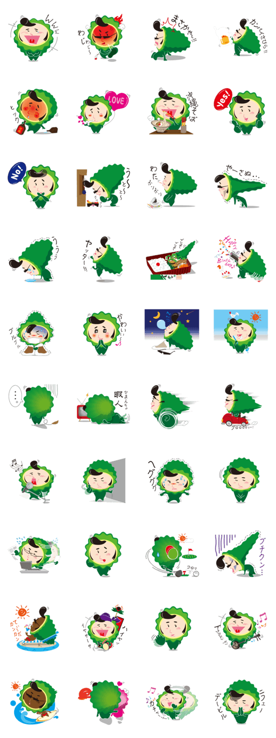 | スタンプ説明 | 沖縄の名産「ゴーヤー」をモチーフにしたキャラクター誕生!つっぱりヘアだけど「ゆるカワ」で謎めいたキャラがアナタのスタンプをもっと楽しく♩ |