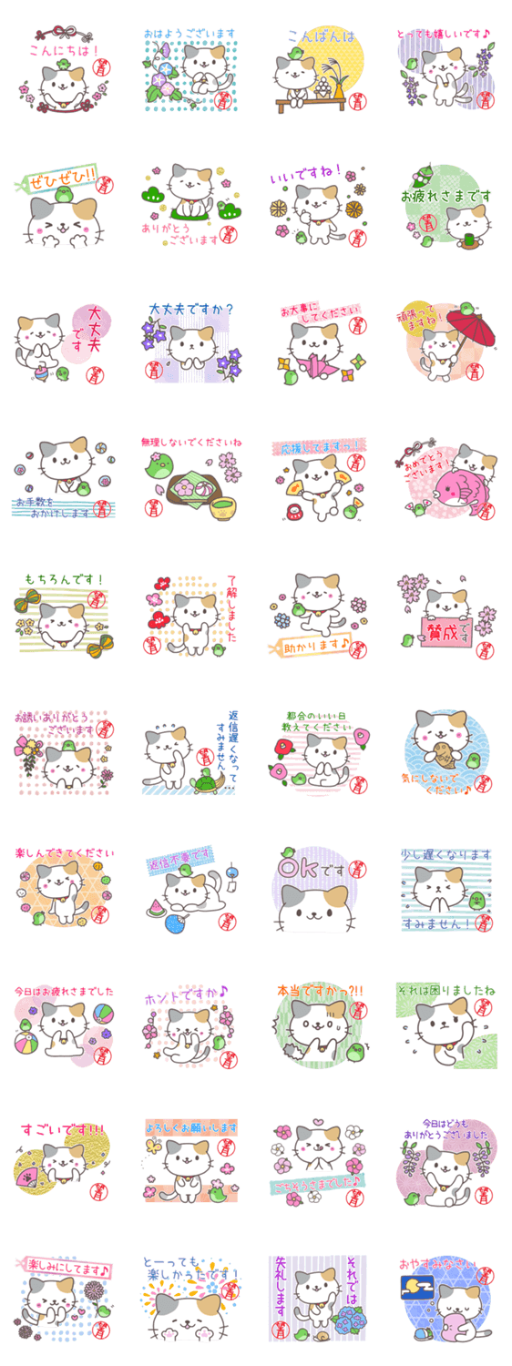 望月さんの名字ハンコ付き、優しい和風敬語。三毛猫の小梅ちゃんとウグイスちゃんが、あなたの気持ち届けます。挨拶、気づかい、感謝、丁寧な言葉などをセレクト。