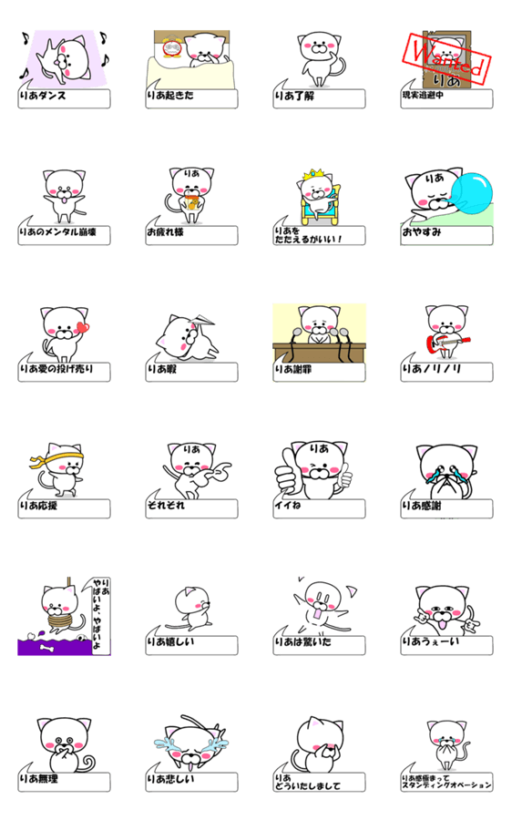 自分の名前に、『りあ』が付く人専用の動く名前スタンプです。りあ、リア、凛彩、凛杏、凜空、梨有、梨藍、理亜、理有、理亜、怜愛、里彩、鈴彩、莉亜、莉明、璃亜等々。