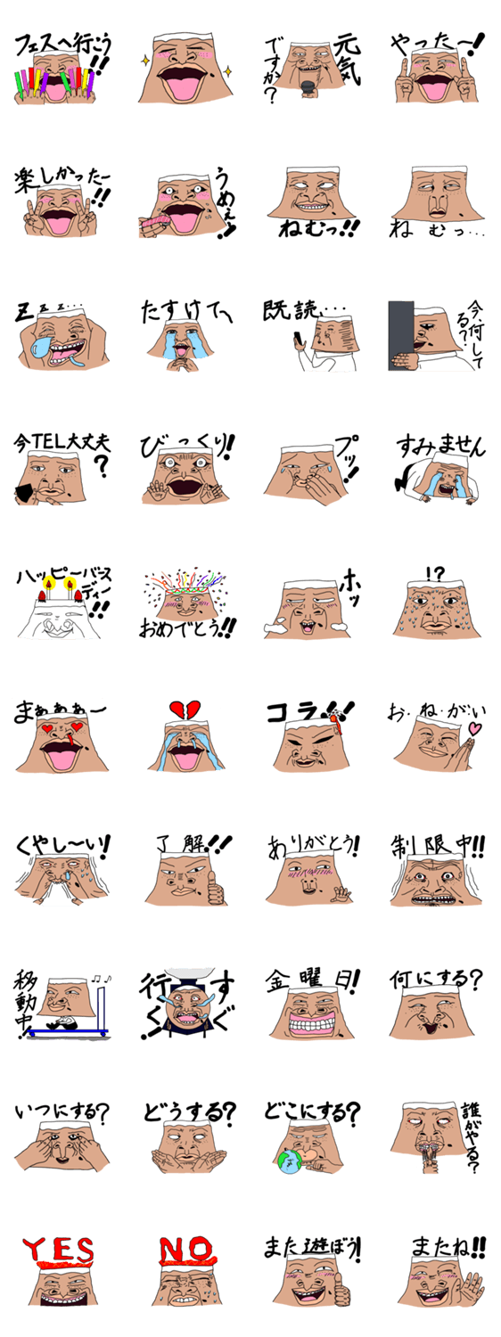 朝起きて髪をセットしようと鏡を見たら、頭が富士山の形になっていた。会社の同僚から付けられた新しいあだ名は、富士雄である。富士雄の日常をスタンプにしました。