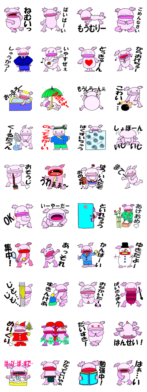 ゆる~いウーパールーパのキャラ達が繰り出す色んなシーンをスタンプに!日常、イベント、その他様々にご活用頂ければ幸いです。