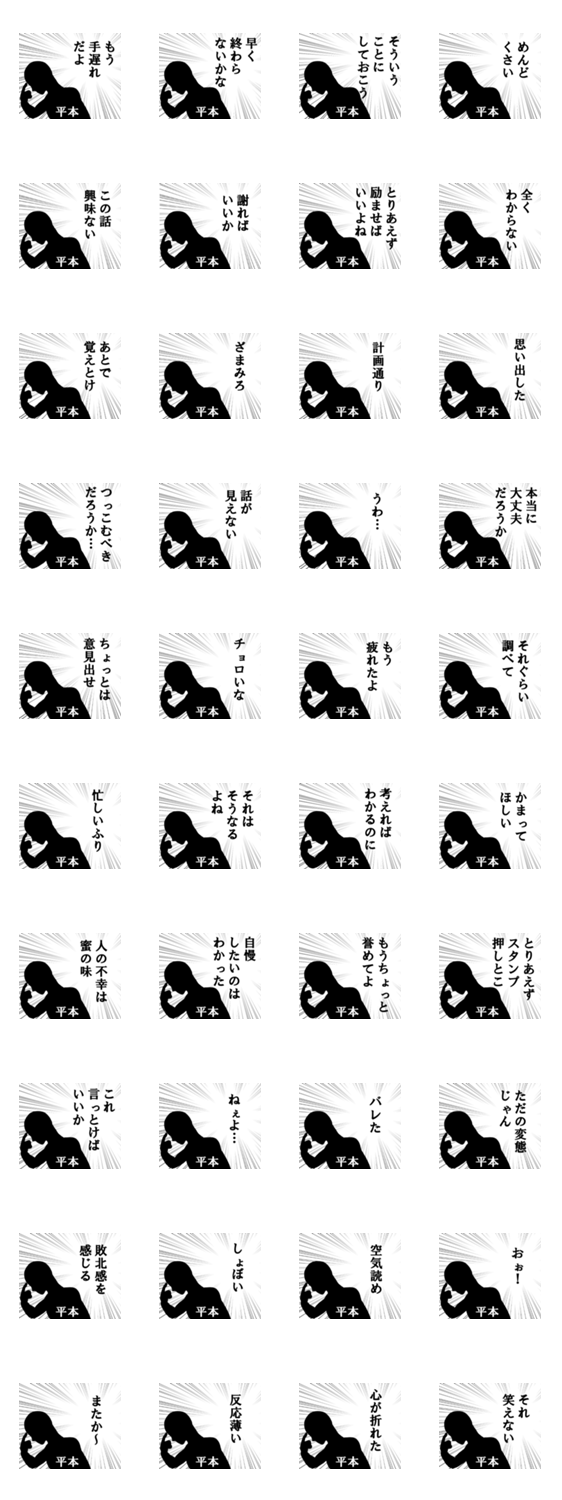 平本(ひらもと)専用スタンプです。言いたいけど言えないあなたの本音を代弁します。気軽に毒舌なつっこみができます。